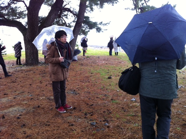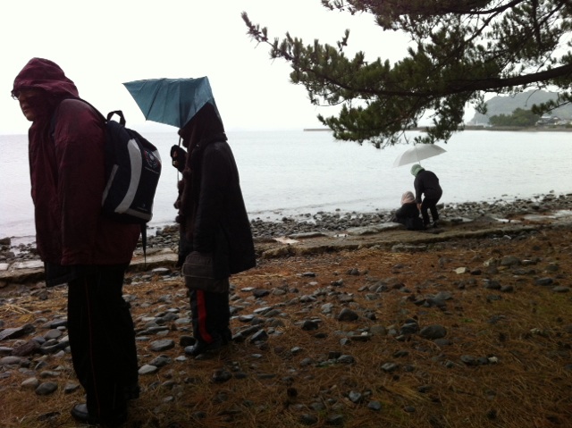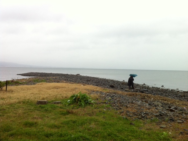 雨の中で、海を見つめて祈っています。