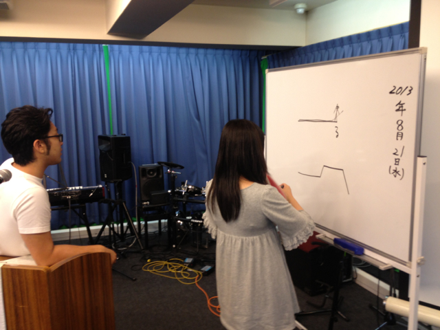 リーダーの萱野さんが音符ではなく音の上がり下がりを書いて、それにあわせて練習です!