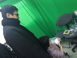 Joy, Joy, Joyのあいちゃん、今日の夜のいやしの集いの映像出しの打ち合わせ中です。