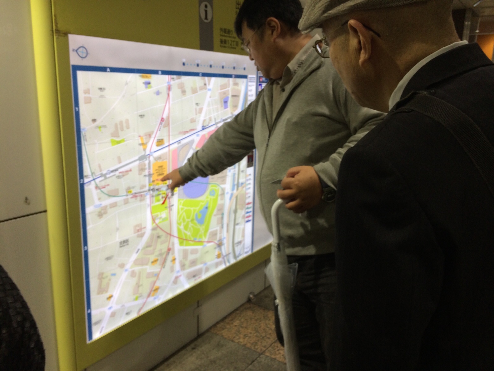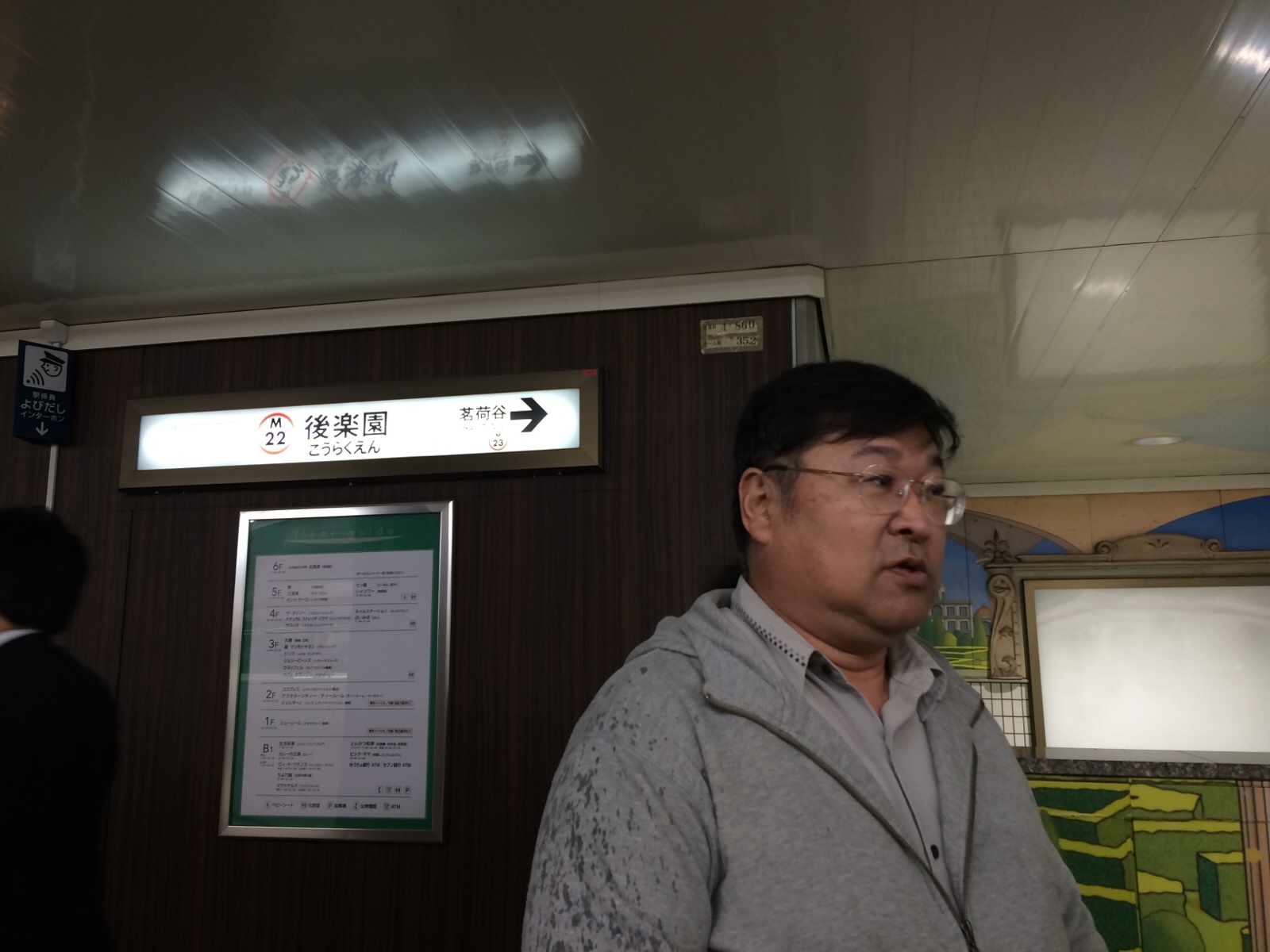 最寄り駅、後楽園駅に着きました。 どっちから出ればいいのかな、と皆で。 (いただきま~す 横尾)