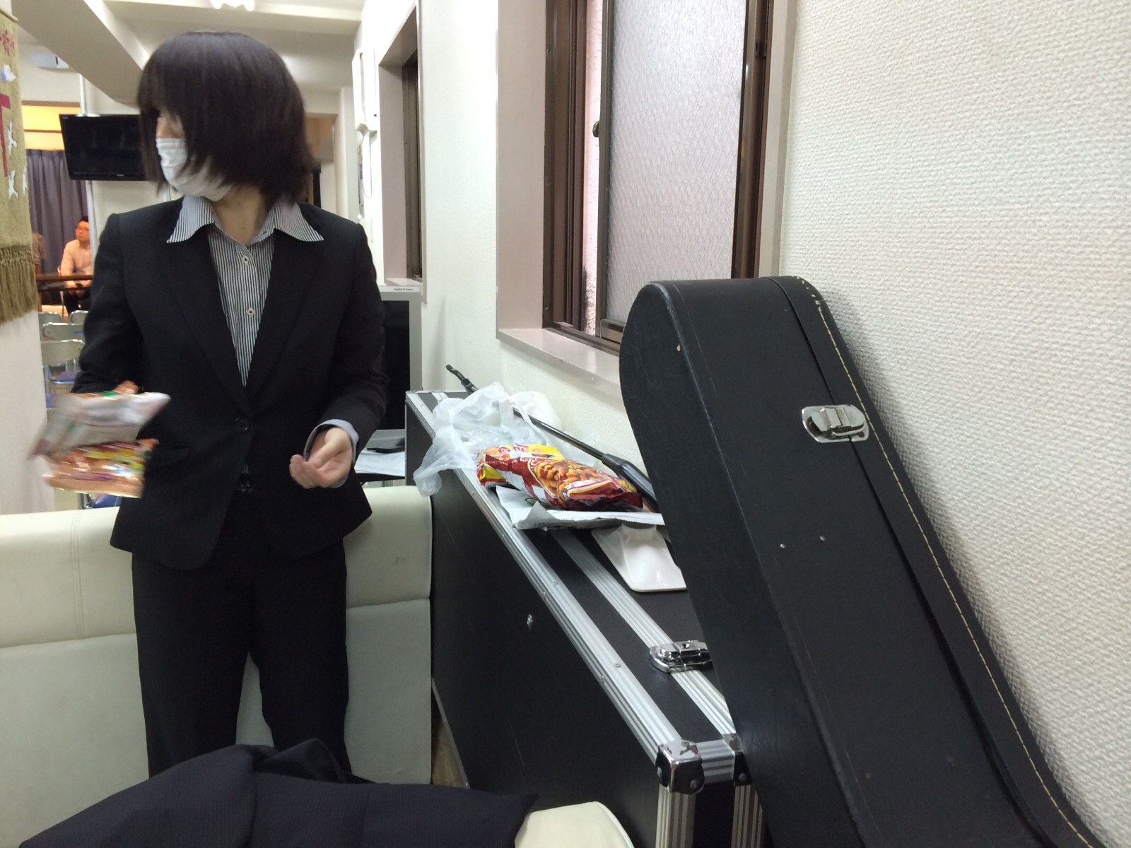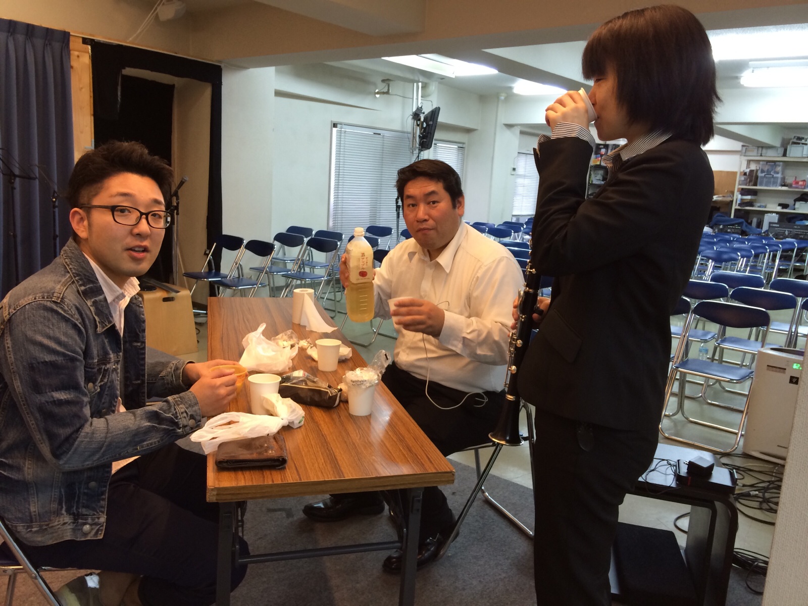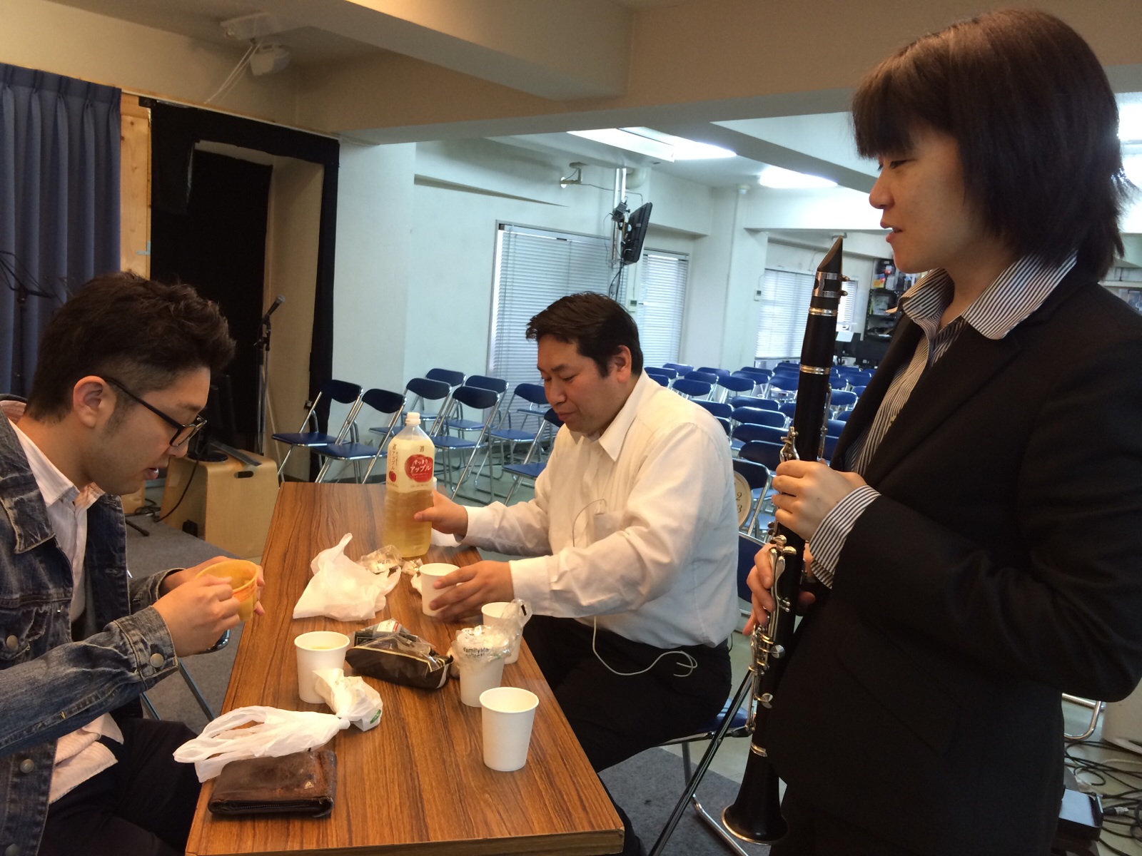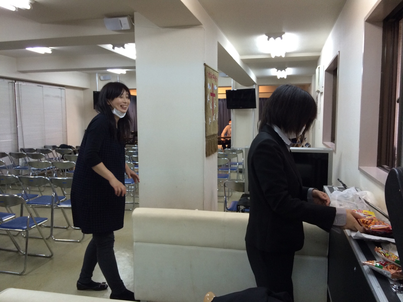 会堂にお菓子があります。 「食べていいんじゃない?」 (いっただきま~す 横尾)