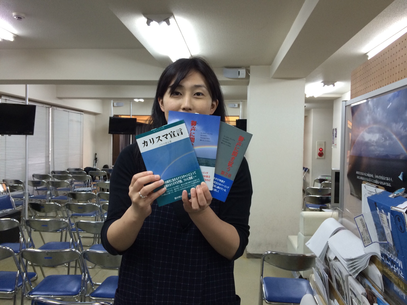 販売の片づけと、来月のカリスマ聖会の準備をしてます。 (いっただきま~す 横尾)