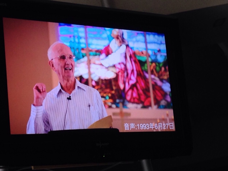 マーリン師を偲ぶ会に用意された今年の映像を見ています。チキンの証は、毎回感動しています‼︎(いっただきま~す 小代)