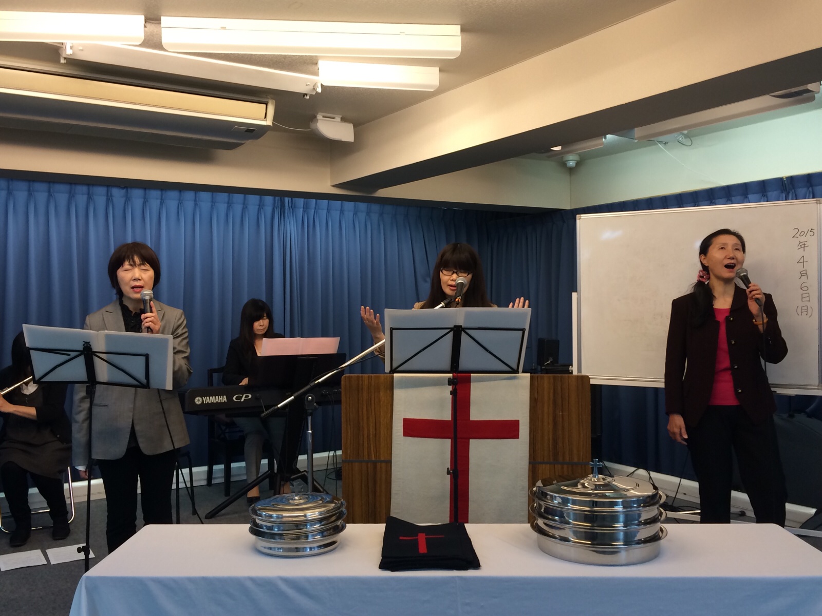 奏楽に、パーソナリティのかやのさんとエステル清水さん。 月曜第一礼拝、フルートも入ってます。 『ゴスペルのご馳走いっただきま~す 横尾』