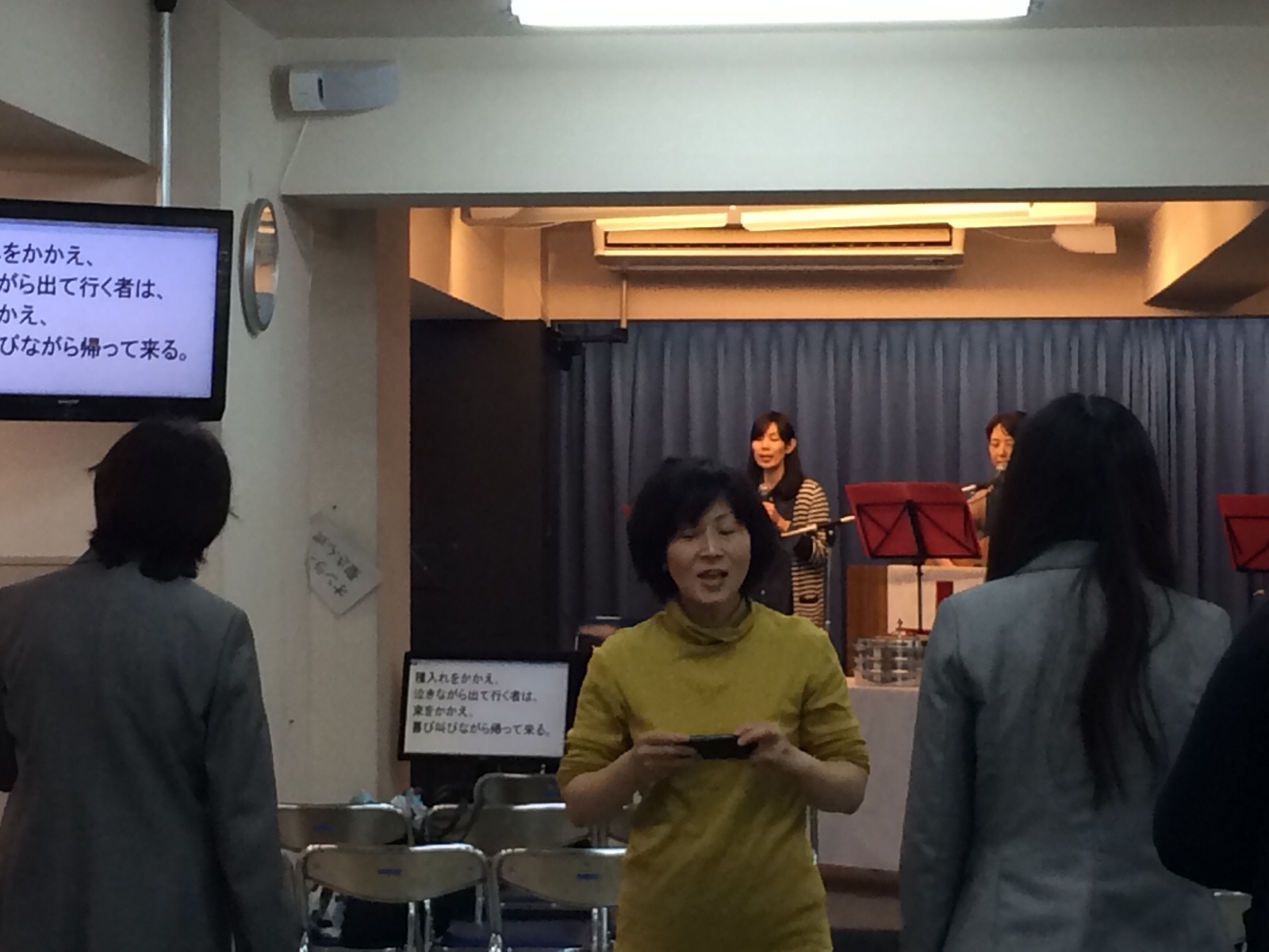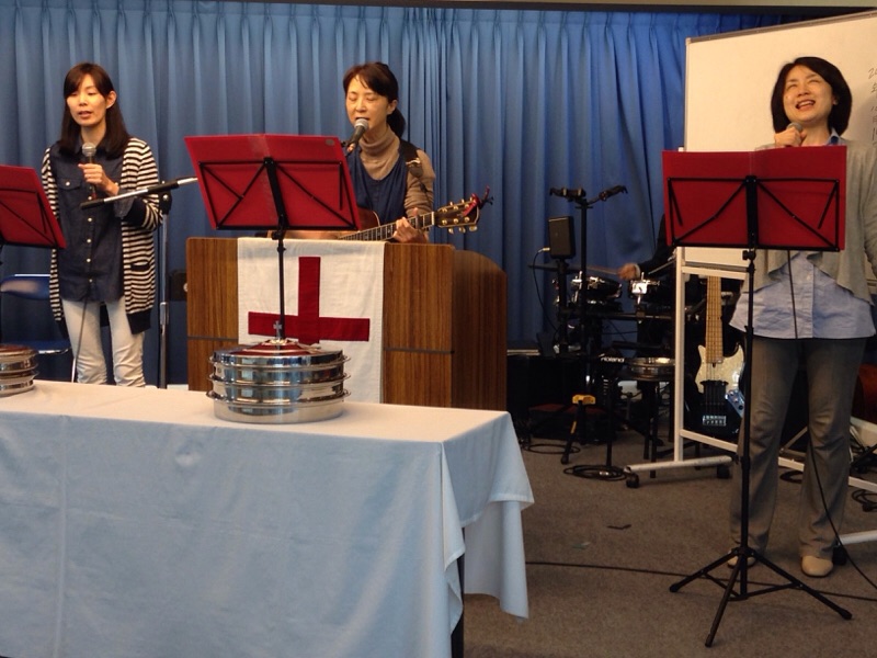 月曜礼拝が始まっています! コーラスとドラムにラジオの3人方がいらっしゃいます♫