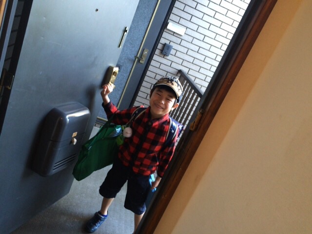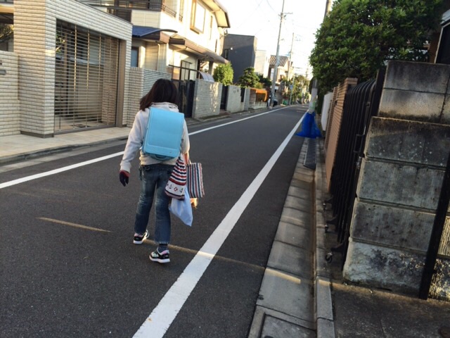 巾着袋やたらいっぱい! ランドセルが右に傾いています^^; 夫婦でドタバタ
