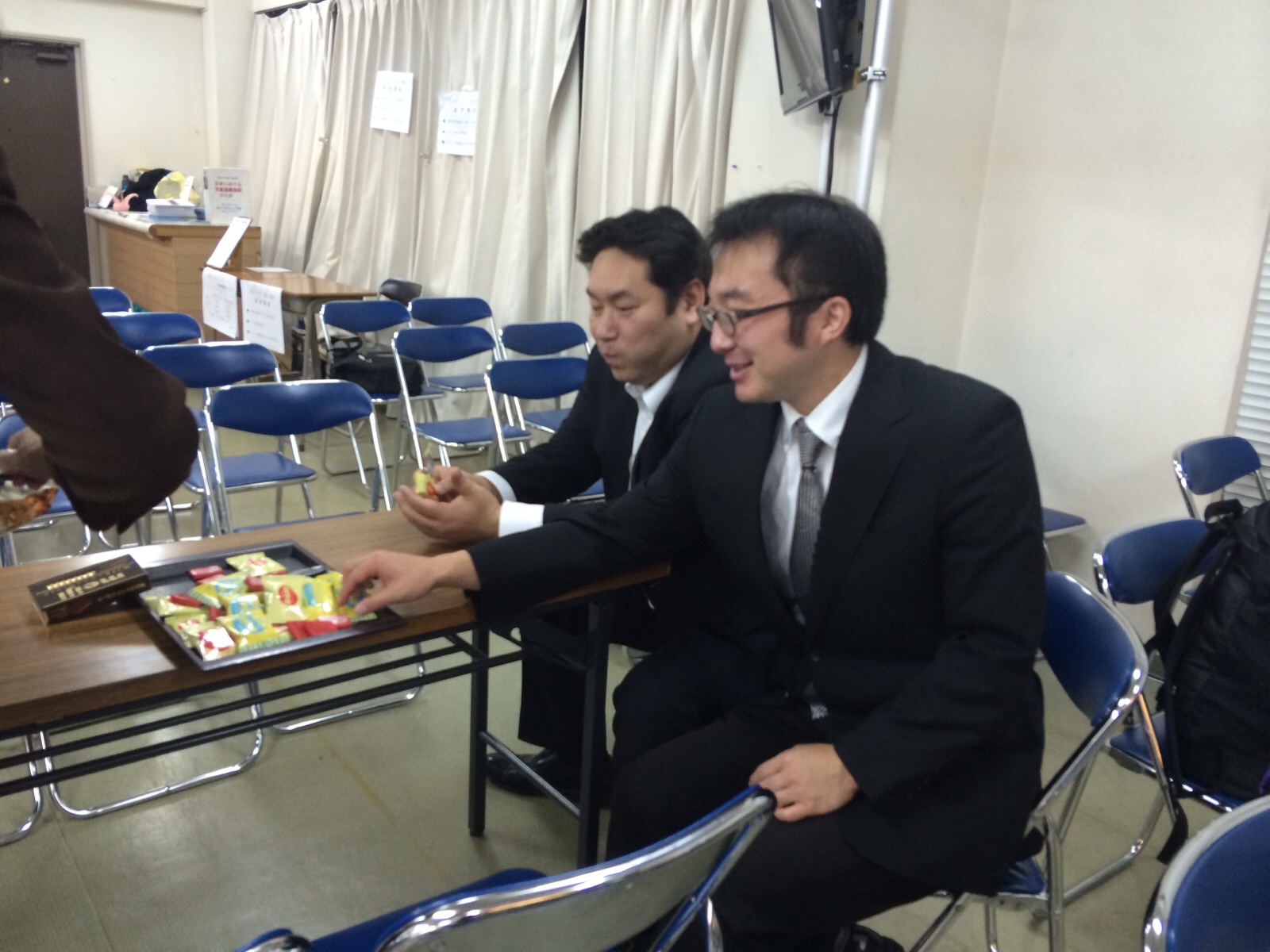 お菓子の前に男性2人。1番のり、みたいな。 「ゴスペルのご馳走、いただきま~す」横尾