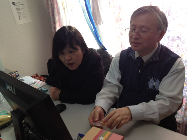 ロビンソンさんの写真を見て懐かしんでいる天谷牧師。