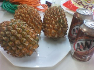 おみやげのスナックパインというパイナップルと、おなじみのルートビア(清涼飲料水)です。