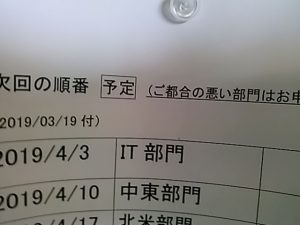 毎週、ミッション事務局内でやっている、セミナー(海外の情勢についてなど)担当の、順番を更新しました。