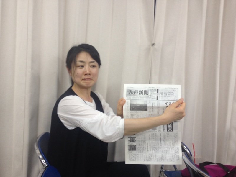 み声新聞を熱心に読んでいる山中さん。 エウカリの記事が掲載されています。