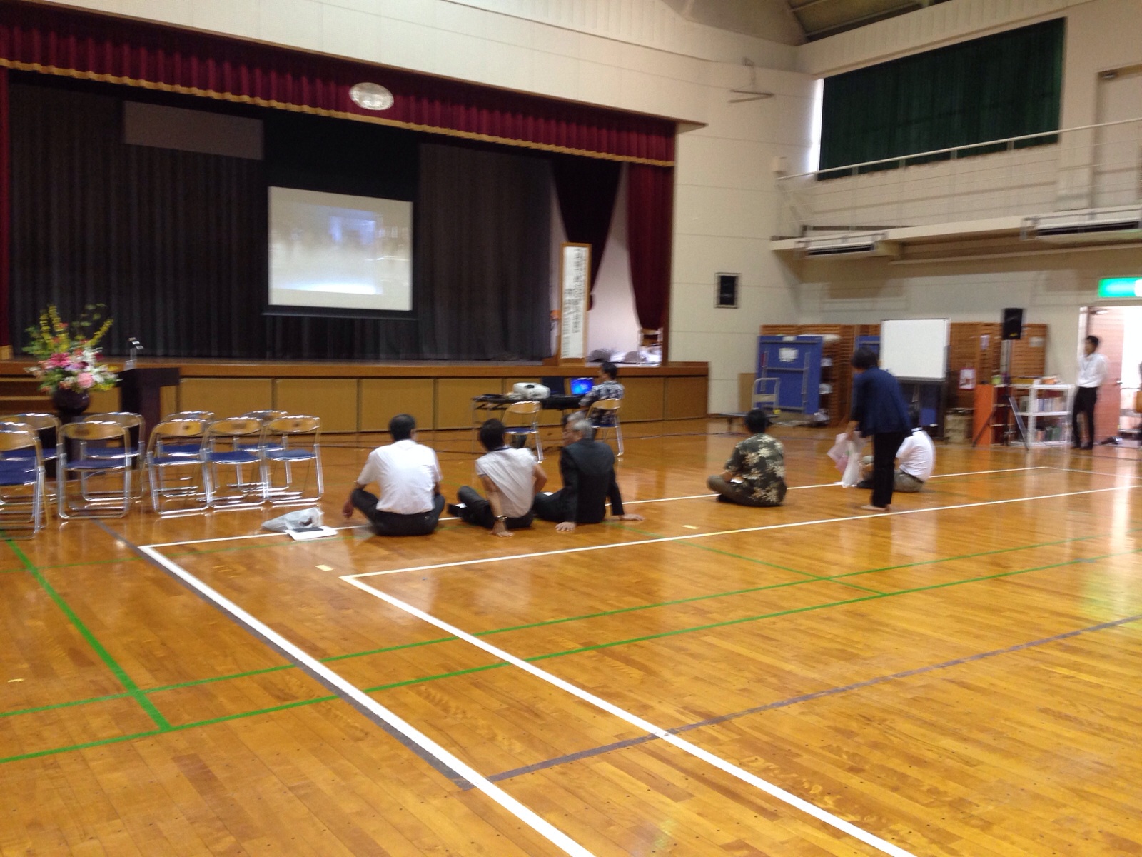全員参加の必修講演会で〜す。 400名分のイスが足りないので、地べたで聴く事になったのだ。