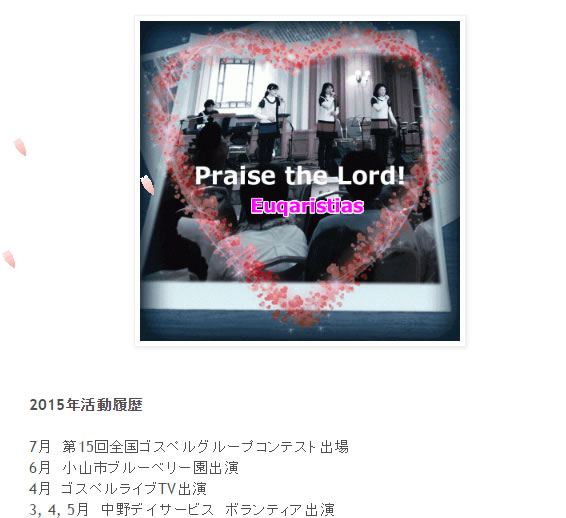 エウカリスティアスは、女性4人のゴスペルコーラスグループです。教会、イベント会場、老人ホーム、デイサービスなどで歌っています。曲は、オリジナルの日本語をおもに、英語でも歌います。楽器は、キーボード、オケBGMを使っています。ボランティアでも歌いますので、お気軽にご連絡ください。