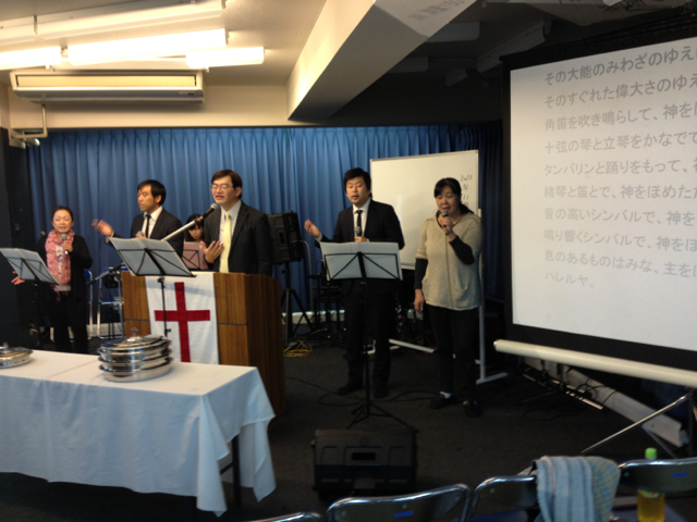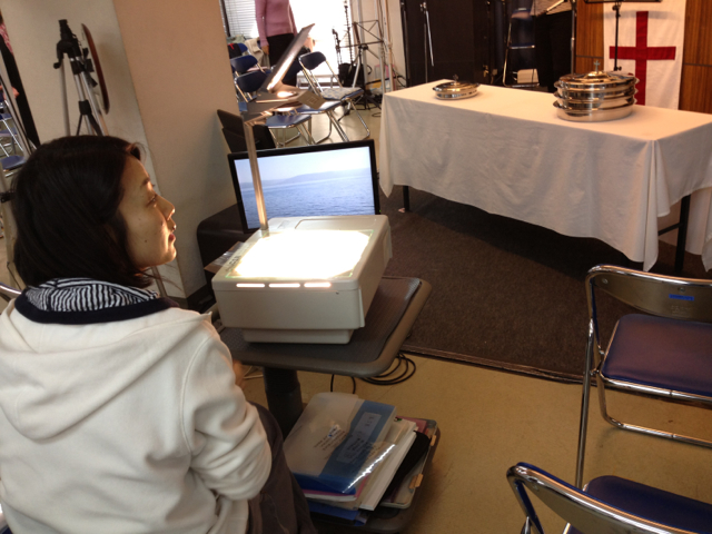 前半賛美は、笠原牧師チームです。 スタッフの山中さんは、今日はOHPのご奉仕です。