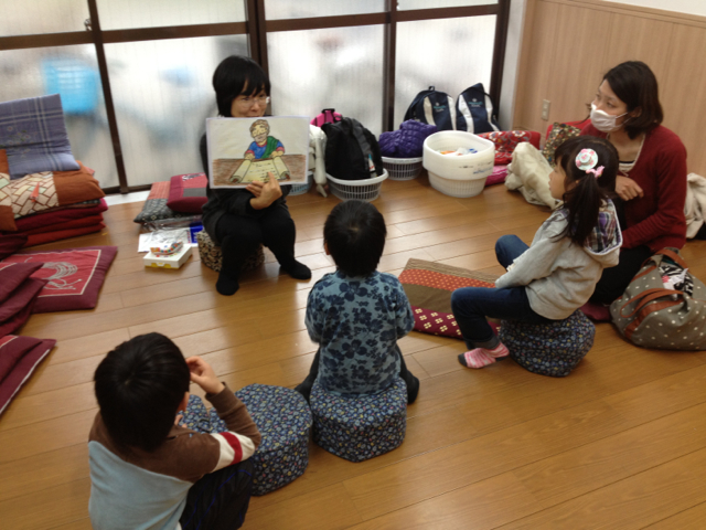 幼児クラスは、紙芝居で聖書のお話をききます。