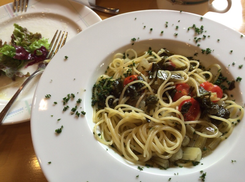 たっぷりサラダと、高菜とオリーブオイルのパスタと、デザートと、ドリンクバーで1000円!