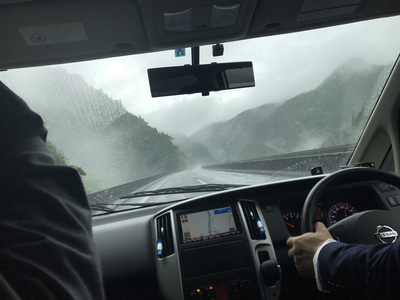 雨が降り、霧状の雨雲が垂れ込む山々。 –sugisawa