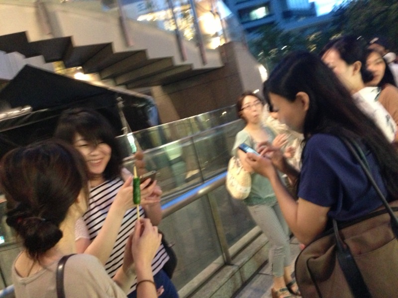 ホタルを待ちわびる女子の一方屋台偵察中。なんかピカピカしたボールをすくっています。
