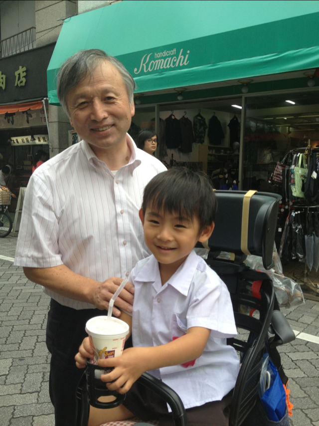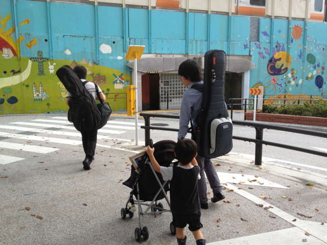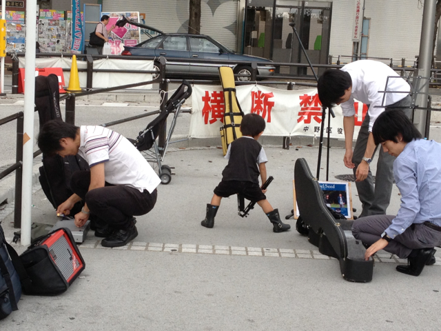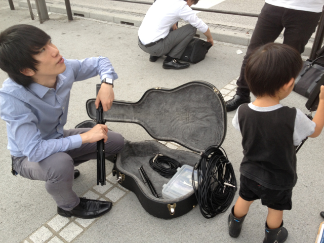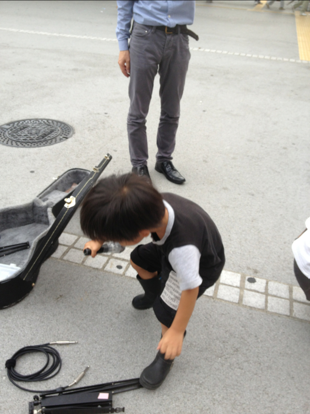路上ライブで、小さなスタッフがお手伝い。 風のひびきのごとく、言葉にいやしが起きた、ヨっさんです!(三本松ジュニア) 自分のベビーカーで、機材を運んでくれるんですよぉ~。 「雲の間にある虹」10月号もお読みください