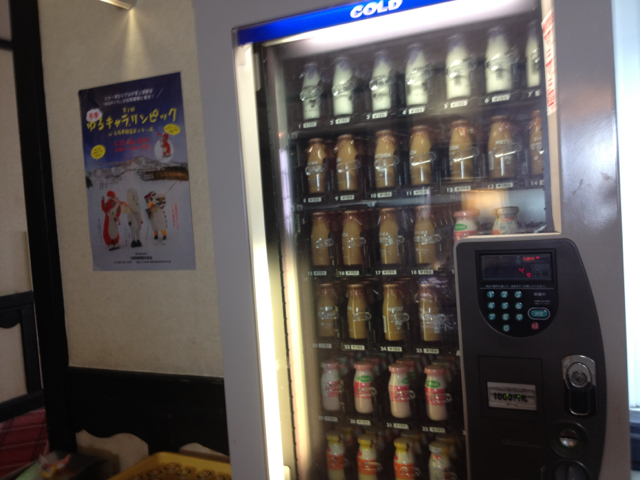 大浴場前の自販機の牛乳は外国人のお客さんにも大人気。 特にいつもすぐ売り切れる珈琲牛乳を増やして下さいと、萱野牧師からリクエストしました。 写真は、まだたくさんある正午ごろです。