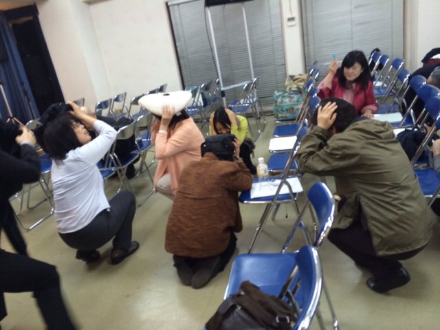 地震が起きました! 危険地帯にいないように、真ん中に頭を抑えて。