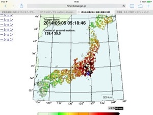 最新最大振幅分布図。 関東地域の揺れ幅が大きいとうことでしょうか? 資料:防災科学研究所