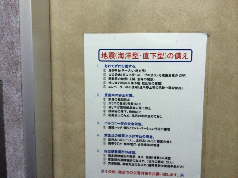 会堂のエレベーター内にも地震の備えに関して、書いてあります!