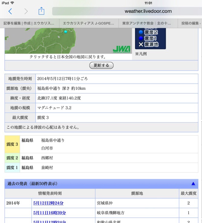 一番最近は、福島のマグネチュード3。 今朝、7時11分頃。
