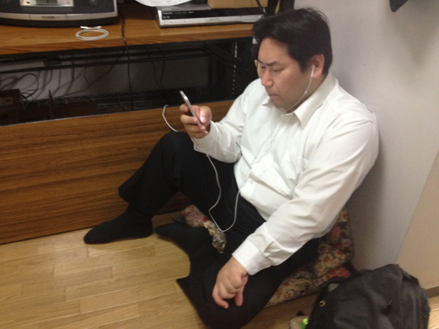 白馬キャンプ実行委員長の真境名牧師、この時間はコンサートの打ち合わせのため来られています。 いつもお気に入りの場所に陣取っています。