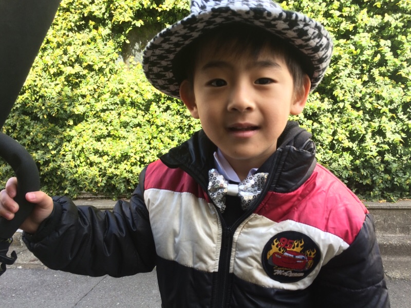 これから家を出ます。 ヨッシーは今日スパンコールの蝶ネクタイ ヨセフ