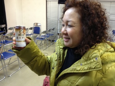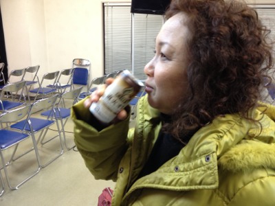 出演するエルサレムのまりこさん。 カメラ向けたらコーヒーを美味しそうに飲んでくれました!