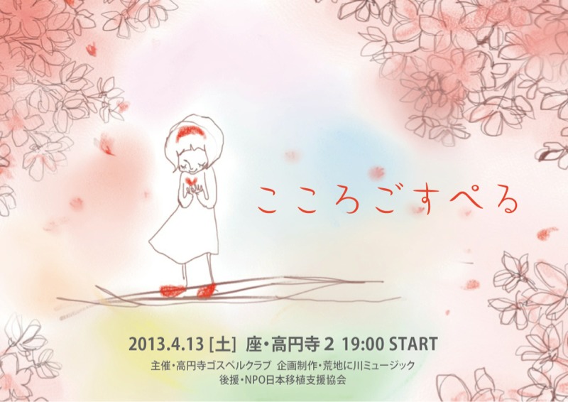 こころごすぺるの名前になった始めの頃は、「こころごすぺる」の文字が目立つ感じのチラシも作られていました。チラシを手に取る方々の目に、心に、印象的に残るこころごすぺるの文字。これでコンサートの名前を覚えてくださった方々も多いのでは。