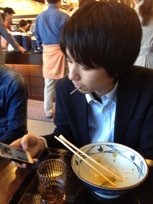 路上ライブの前に、うどん屋で腹ごしらえの前の図。 余裕の表情です。