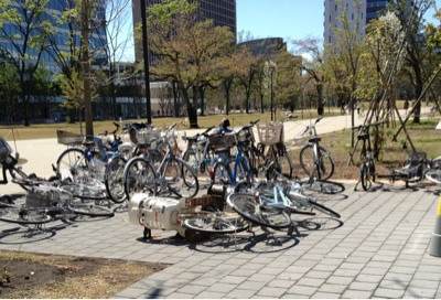 風で自転車が軒並み倒れてます。 路上ライブでチラシや看板が飛ばされずできますように。