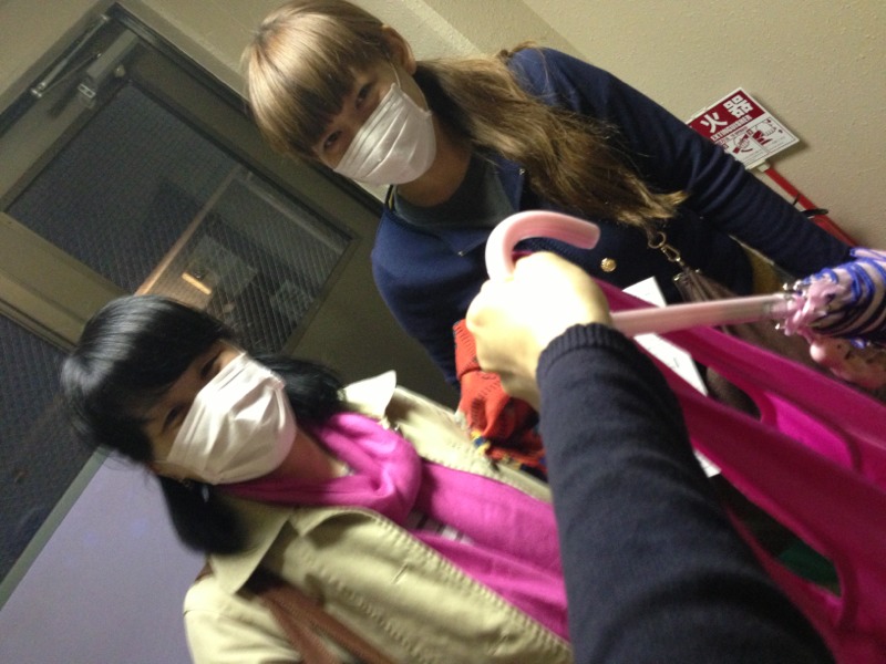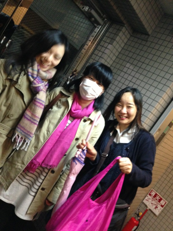 先ほどのこのブログにあったイメージシリーズに便乗!くりちゃんのマフラーと私の100円エコ袋と傘もピンク!そして!くりちゃん、ゆみちゃん、2人のマスクは、これもまたピンク!