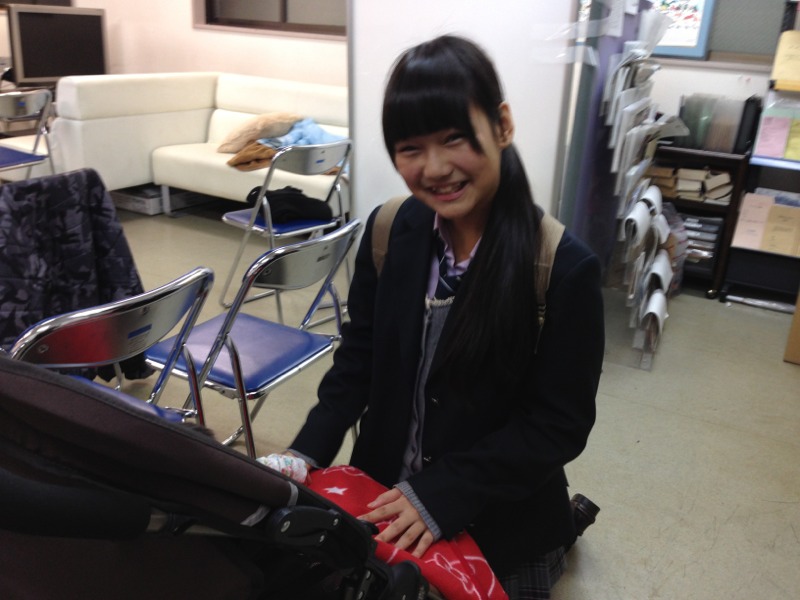 さっきのピンクのマスクのお二人、自分達の写真を見て大爆笑!「この2人、こわい〜!」だって(笑)みなさんが怖がるから絶対撮り直した方がいいよ!と言っていました。そして撮り直したのがこの写真。ゆみちゃんリクエストで今度はピンクストライプマフラー小林さんも一緒に!こころごすぺる、ミカエルさん談ピンクのやさしいイメージに便乗!