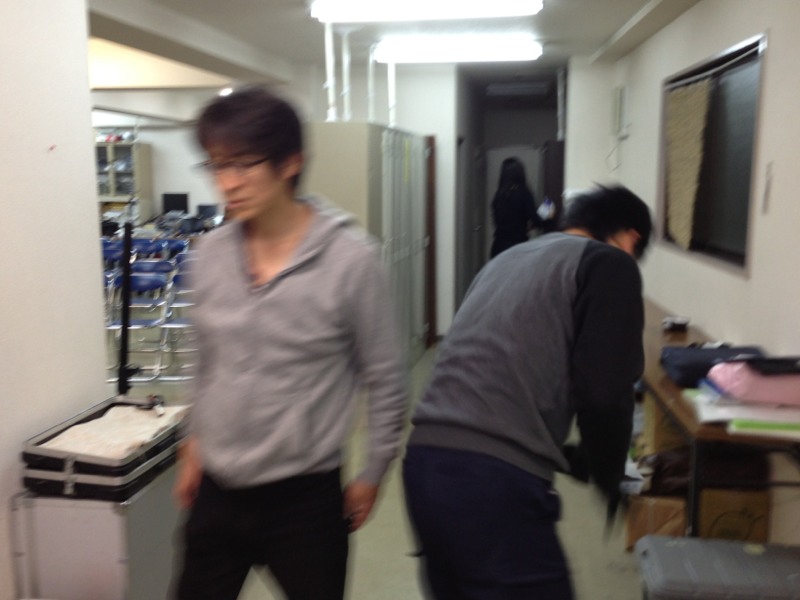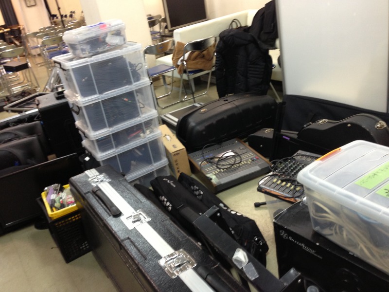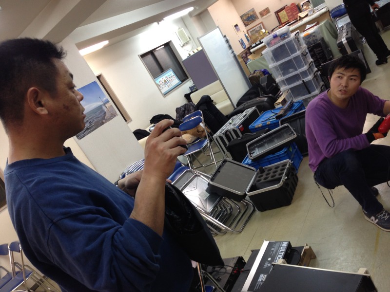 設営部隊は、コンサート機材搬出。このものすごい量の機材を車に詰め込み作業します。