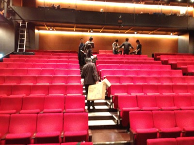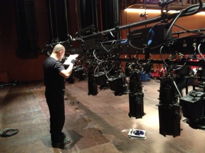 ステージでは、照明の準備中です。