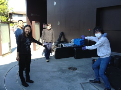 機材を会場へ運びこんでます。