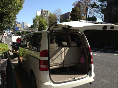 会堂前で昨日乗せれなかった機材を乗せます!