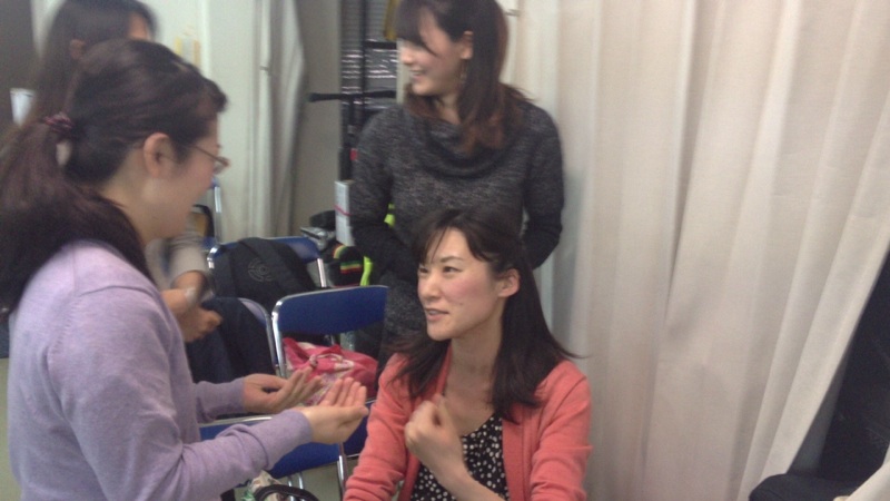 出演のしおこちゃんのヘアメイクをするチャチ。
