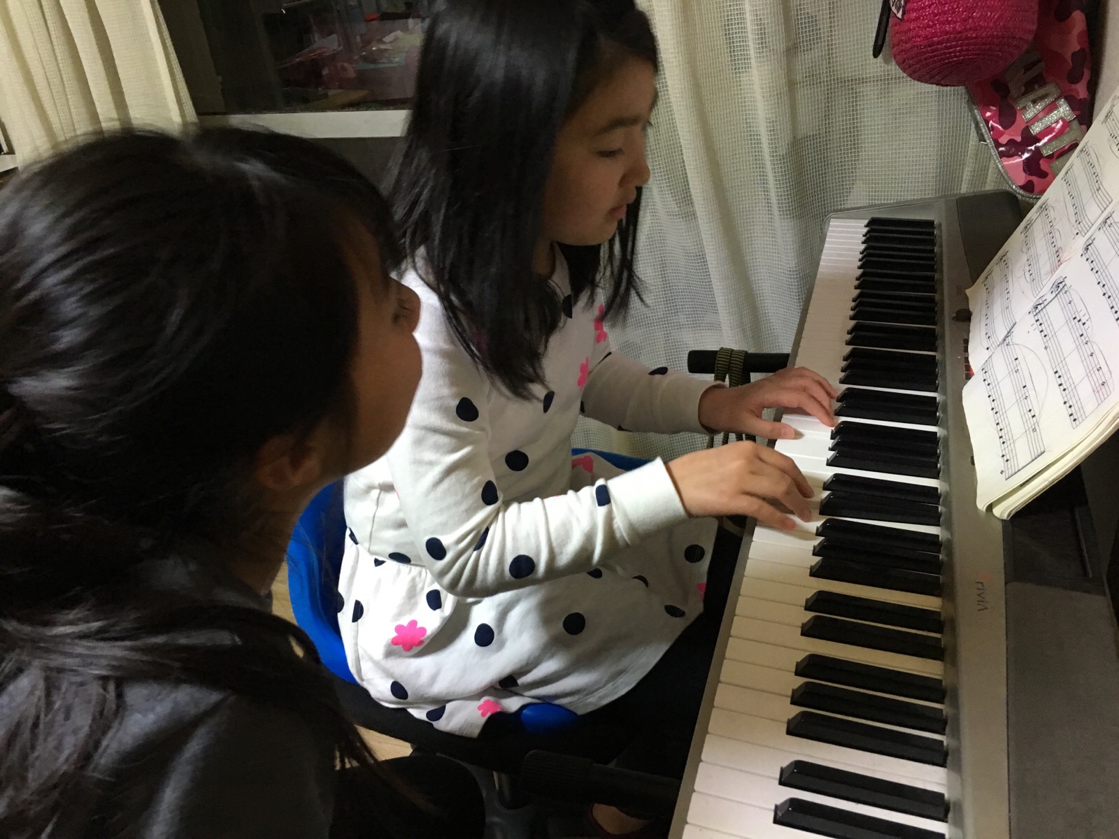 ピアノ練習してます。 お姉ちゃんがリズムに合わせて、手は丸く〜♬終わりは静かに〜♬と指導してくれてます(^^) しるし