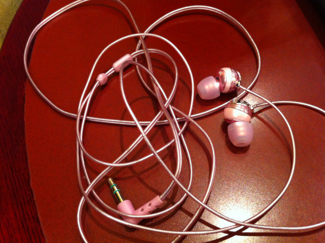 ピンクの丈夫な可愛いイヤフォン。でも いろんな所に引っ掛けて、今じゃ右しか聞こえんの。