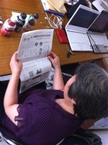 辻郷牧師によるスプレンダーのボイストレーニング2日目です。 始まる前少しの時間、ご自身が書かれたみ声新聞読んでおられます。 john