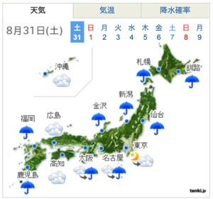 明日も35℃の猛暑となるそうです。が、今の天候が、東京以外がすべて雨と曇マークが面白い?