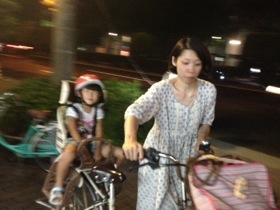 自転車の後ろにさっそうと乗り込み、ベルトとヘルメット装着!シオンちゃんかっこいいな〜!