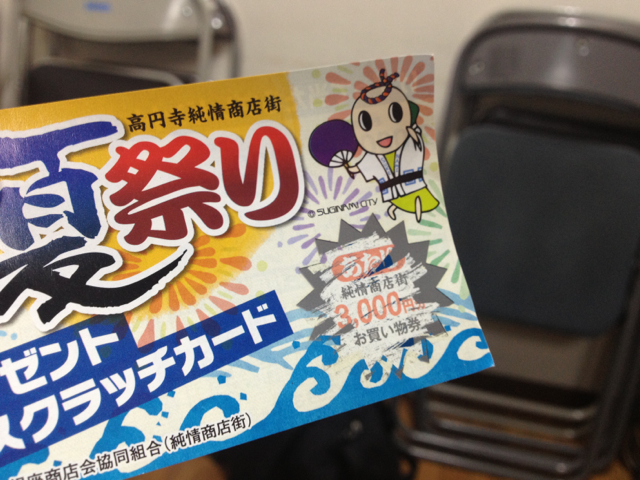 家族で外食。 それも高円寺で。 そのワケは、この「あたり」のスクラッチカード。期限は今月いっぱい。 さて、どこに行こうかな?