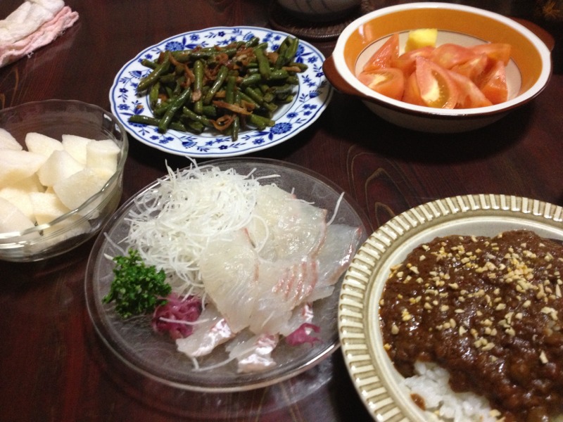 実家での夕食です! カレーに、鯛のお刺身に、長豆と生姜の炒めものなど、和洋混ざってますが。