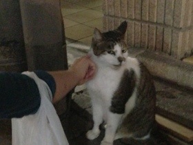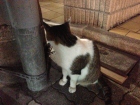 道端にねこ。小代さんが、なでてあげると気を良くして、もっともっと!と後ろをむいたまま動かないねこさん。ユニークなねこです。