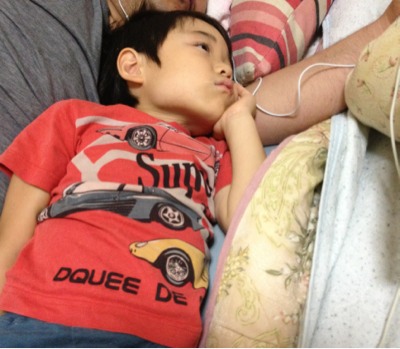 お父さんの腕の中でiPhone鑑賞中の息子。 左手に注目!